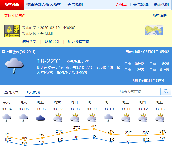 見(jiàn)圳客戶端·深圳新聞網(wǎng)2020年3月4日訊 深圳市氣象臺(tái)預(yù)計(jì),4日我市陰天間多云有小雨,氣溫18-22℃,東風(fēng)3-4級(jí),夜間起沿海和高地有7-8級(jí)陣風(fēng);5日小雨局部中雨,伴有零散雷暴,明顯轉(zhuǎn)涼;6日偶有分散小雨;7日起轉(zhuǎn)多云,氣溫回升。