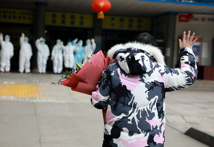 不一會(huì)兒,7名穿著防護(hù)服的醫(yī)護(hù)人員將張冬雪護(hù)送了出來(lái)。剛一露面,人群中立刻響起一陣掌聲。2位早已在大門(mén)外等候的護(hù)士激動(dòng)地上前與張冬雪擁抱,段昌奉也沖上去把飽含大家祝福和關(guān)心的鮮花獻(xiàn)給她。張冬雪笑著向人群揮手,走了幾步后,又回頭向依然站在門(mén)口目送她的7名醫(yī)護(hù)人員深深鞠了一躬,“謝謝,謝謝你們?!?/p>