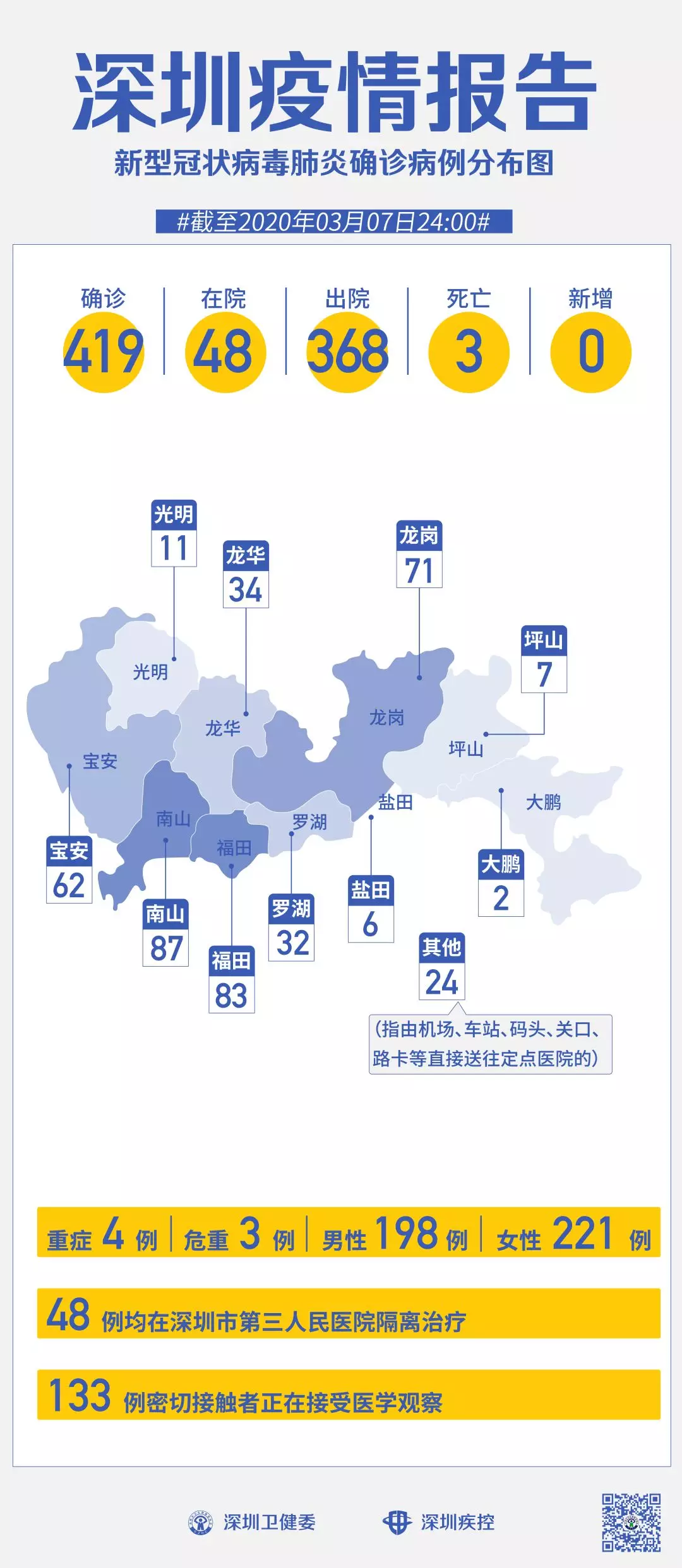 截至3月7日24時(shí),深圳累計(jì)報(bào)告“新冠肺炎”確診病例419例。3月7日當(dāng)天全市無(wú)新增確診病例,當(dāng)天出院病例7例(從2月26日起不再公布出院個(gè)案)。