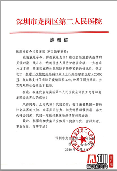 “我不認(rèn)識(shí)你,但我要謝謝你!”3月2日,龍崗區(qū)第二人民醫(yī)院院長(zhǎng)林源泉還特地向百合集團(tuán)凌國(guó)強(qiáng)董事長(zhǎng)寫了一封感謝信。