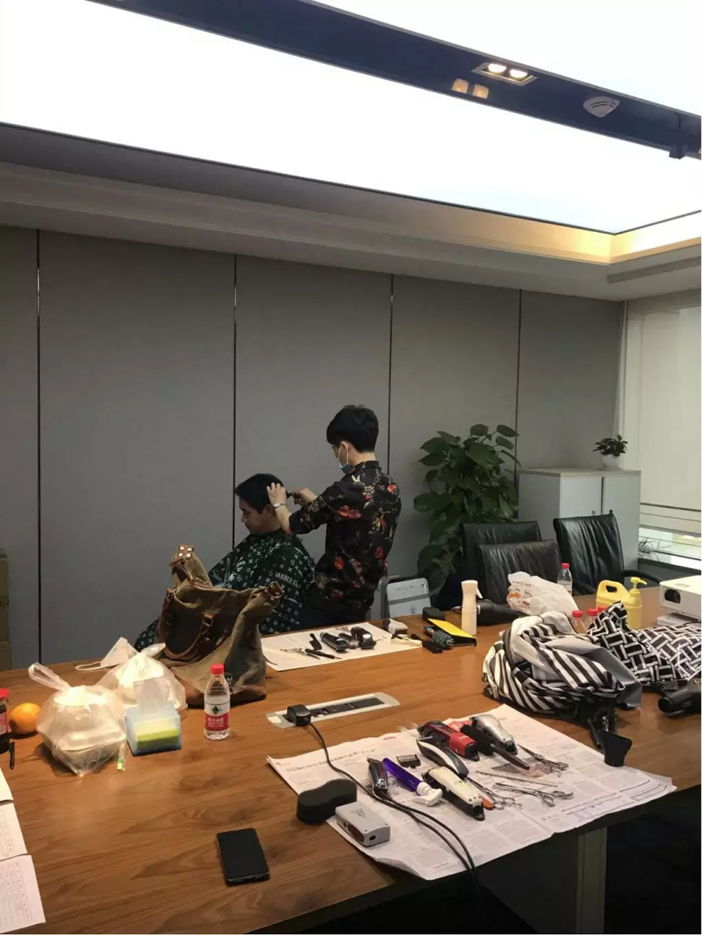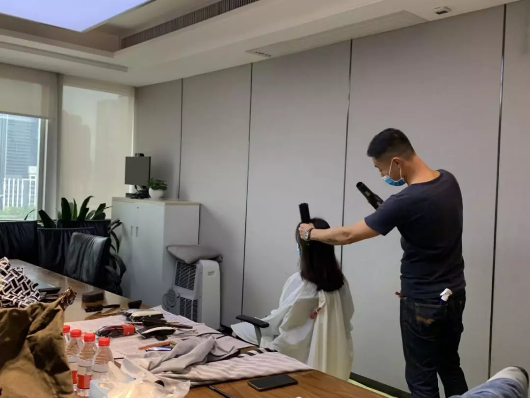 公司本部,1303會議室,臨時理發(fā)室“生意”也火爆極了。公司工會邀請了兩名專業(yè)的Tony老師,為近90名員工提供免費的理發(fā)服務(wù)。為減少人員聚集,理發(fā)采取提前線上預(yù)約,分時段進(jìn)行,確保安全的同時,盡可能讓有需要的同事都能理上發(fā)。鋪上一次性地毯,坐上椅子,圍上一次性“斗篷”,Tony老師一頓熟練的剪發(fā)操作后,再用吹風(fēng)機(jī)整好造型,就完成了理發(fā)的全過程。臨時理發(fā)師的搭建,有效解決了員工生活上的困難,幫助他們以良好的精神面貌投入工作來。