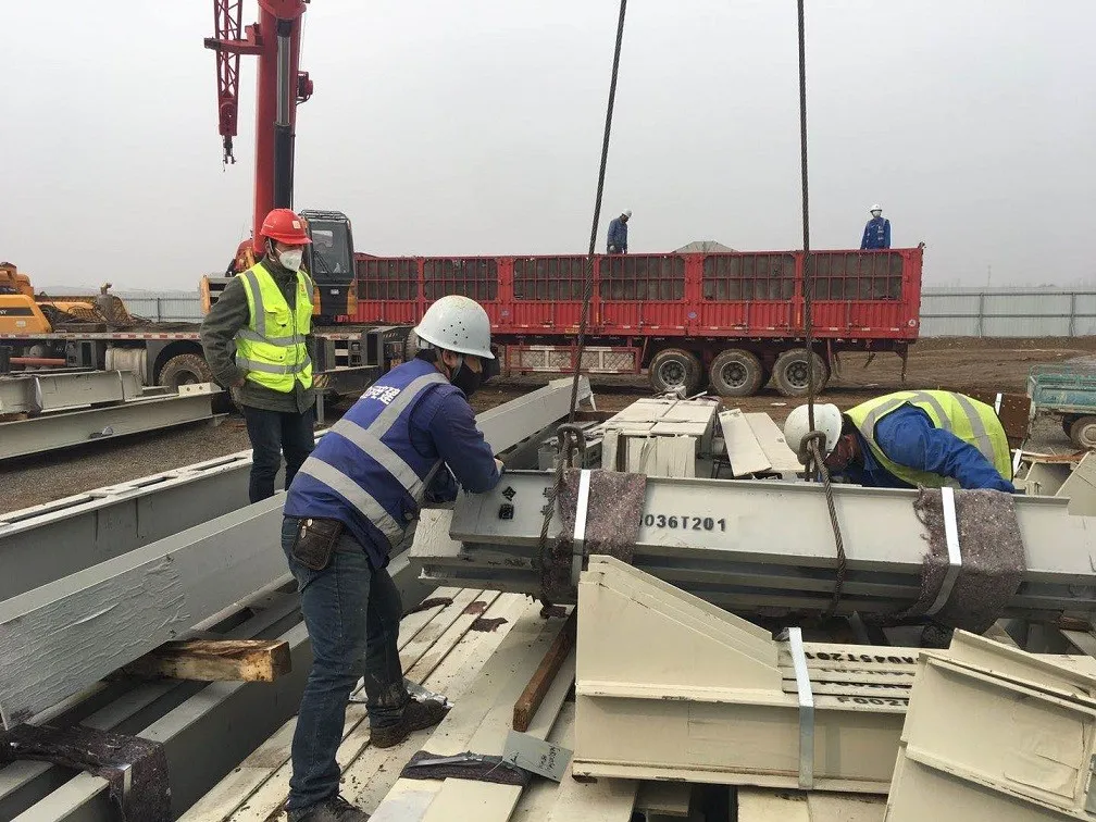 任丘能源生態(tài)園復(fù)工后首車鋼結(jié)構(gòu)到現(xiàn)場,相關(guān)人員正在有序清點(diǎn)、卸車、堆放,為下一步安裝工程夯實基礎(chǔ)。
