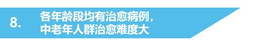 ▲各年齡段均有治愈病例,但從治愈率曲線可以看出,隨著年齡增加,治愈率有所下降,治療難度逐步上升。