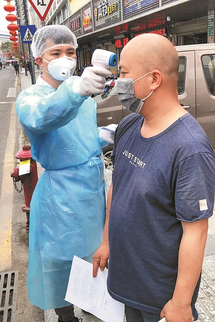曾煥文(左)為居民測(cè)量體溫。