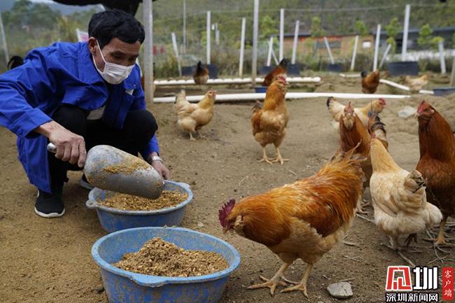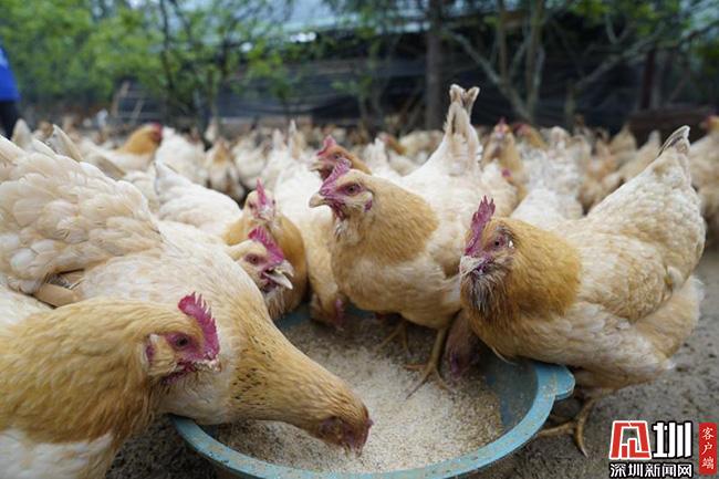3月11日的清晨,66歲的王子平頂著薄霧,在田西村百香雞孵化養(yǎng)殖基地中,撒下了喂養(yǎng)雞群的百香果玉米等混合飼料。這些雞,已經(jīng)在田西村山坡上散養(yǎng)了超過(guò)240天,也就是扶貧產(chǎn)業(yè)農(nóng)產(chǎn)品“百香雞”。這是深圳南山對(duì)口扶貧連平縣百香雞孵化養(yǎng)殖基地的一個(gè)勞作場(chǎng)景。