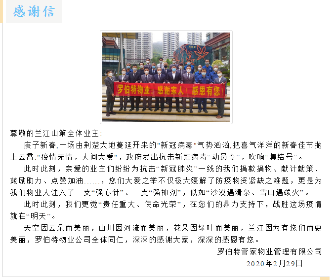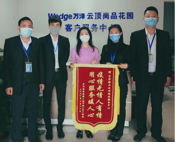 云頂尚品小區(qū)業(yè)主為了感謝物業(yè)在疫情防控期間堅守崗位,也自發(fā)組織捐款21250元為物業(yè)單位員工獻愛心,并送上寫著“疫情無情人有情,用心服務暖人心”的錦旗。