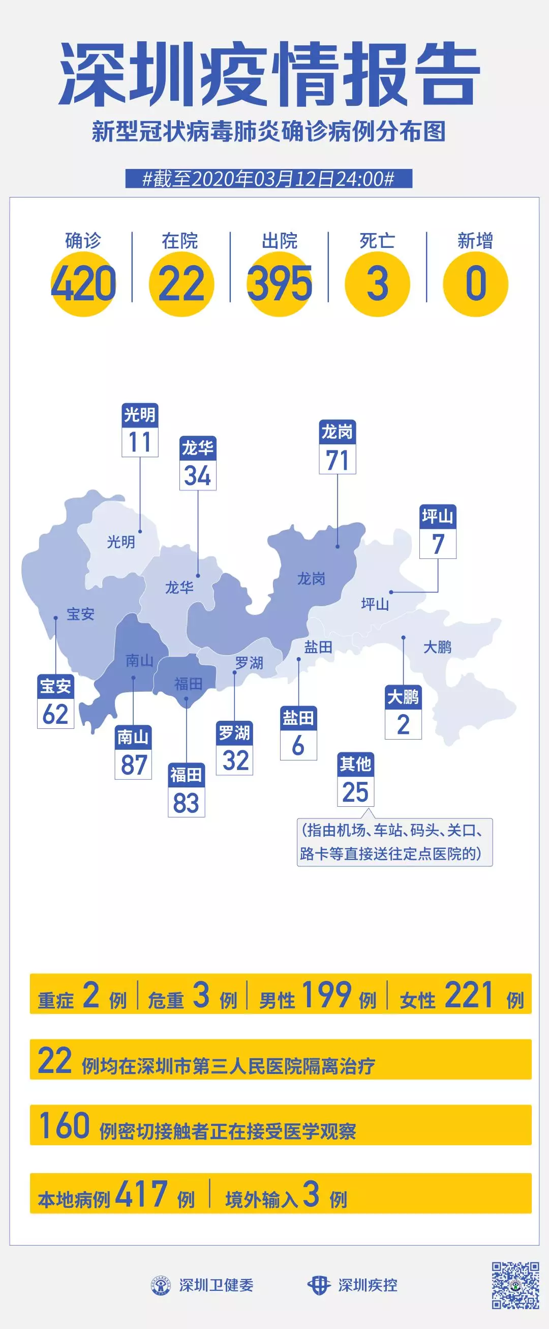 截至3月12日24時(shí),深圳累計(jì)報(bào)告“新冠肺炎”確診病例420例。3月12日當(dāng)天全市無新增確診病例,當(dāng)天出院病例3例。