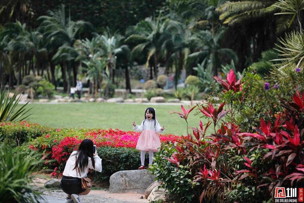蓮花山公園一角,鮮花盛開,一位家長(zhǎng)正為她的孩子拍照。