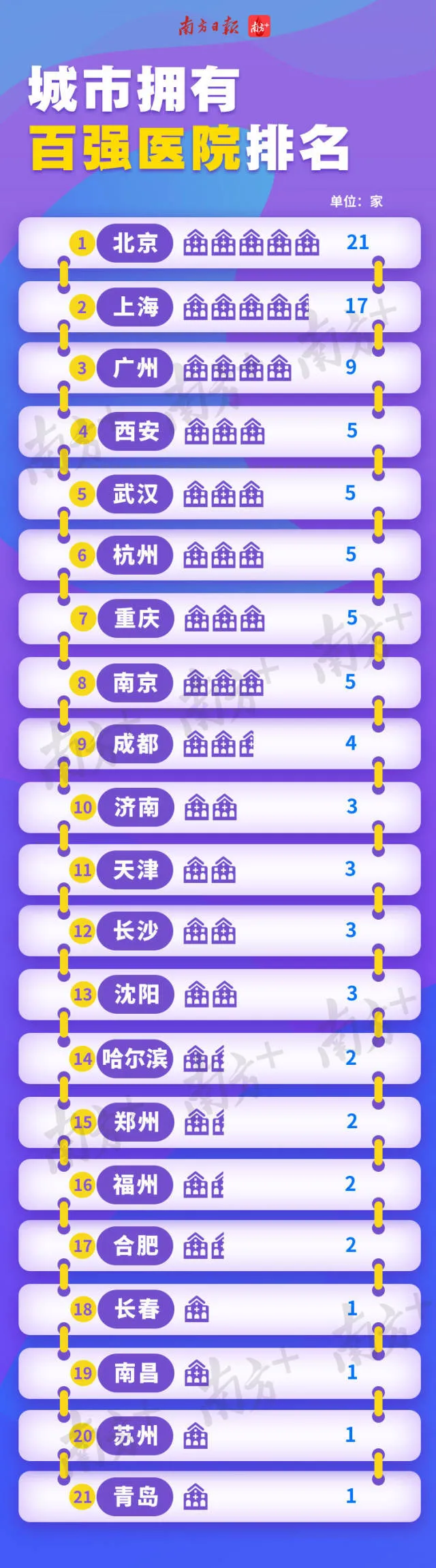 南方經(jīng)濟(jì)智庫(kù)梳理后發(fā)現(xiàn),全國(guó)排名前100的醫(yī)院中,47所被北京、上海、廣州囊括。前10個(gè)城市包攬幾乎總數(shù)80%的百?gòu)?qiáng)醫(yī)院。