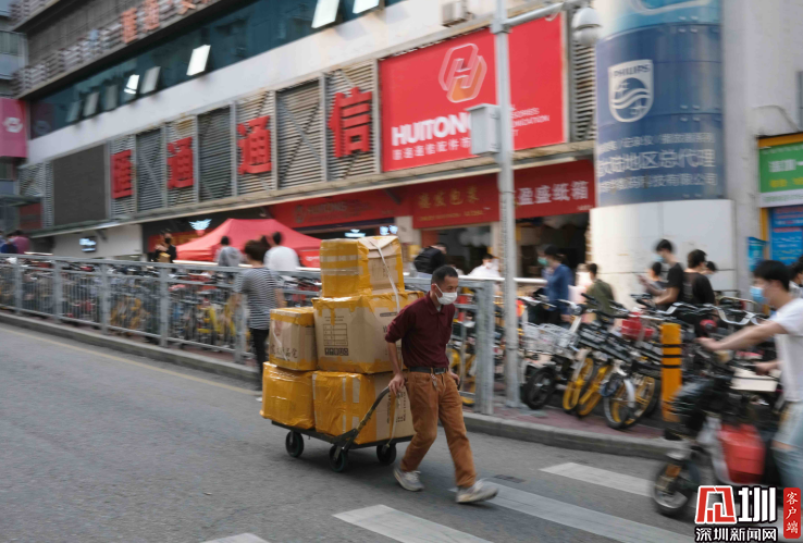 3月16日下午,賽格通訊市場門口,一名拉著小推車的人經(jīng)過。
