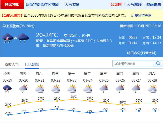 當(dāng)前,深圳已進(jìn)入強(qiáng)對(duì)流天氣多發(fā)季節(jié)。未來幾日天氣是否平穩(wěn)?據(jù)市氣象臺(tái)預(yù)測(cè),19日深圳有雷陣雨,局部大雨,氣溫20℃至24℃;20日陣雨轉(zhuǎn)多云;21日至24日濕度加大,氣溫逐日回升,天氣轉(zhuǎn)熱,早晚有輕霧或霧。