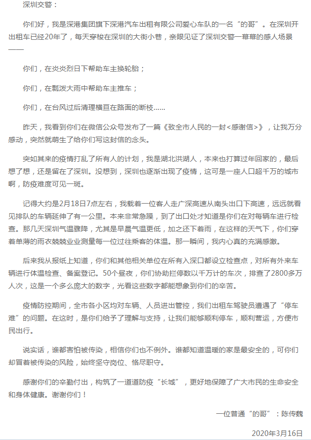 3月16日,深圳交警在微信公眾號發(fā)了一封感謝信。