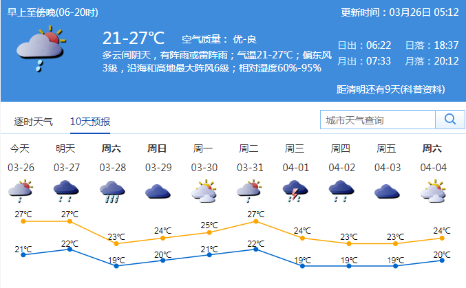 見圳客戶端·深圳新聞網2020年3月26日訊 今日深圳多云間陰天,有陣雨或雷陣雨;氣溫21-27℃。受偏南暖濕氣流影響,最近深圳天氣溫暖,氣溫回升明顯,最低氣溫在20℃以上,連續(xù)4天最高氣溫突破28℃。