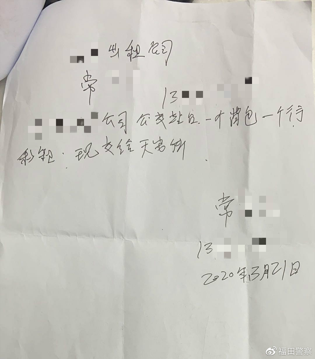 3月21日晚,一輛的士開(kāi)到深圳市公安局福田分局天安派出所門口,的士司機(jī)從車上拿下來(lái)一個(gè)黑色的背包和銀色的行李箱到前臺(tái)。