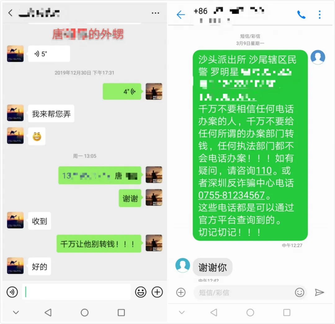“有些事主被騙子‘洗腦’后,電話(huà)里表示相信我們,但是轉(zhuǎn)頭又去給騙子轉(zhuǎn)錢(qián)了。徐女士不在深圳,所以我們?yōu)榱舜_保她真的擺脫騙局,又讓她丈夫給她打電話(huà),還讓房東幫忙撥通視頻通話(huà),我一點(diǎn)點(diǎn)給她講解騙子的詐騙手段,她這才幡然醒悟,沒(méi)有給騙子轉(zhuǎn)錢(qián)?!鼻浼t鈺說(shuō)道。