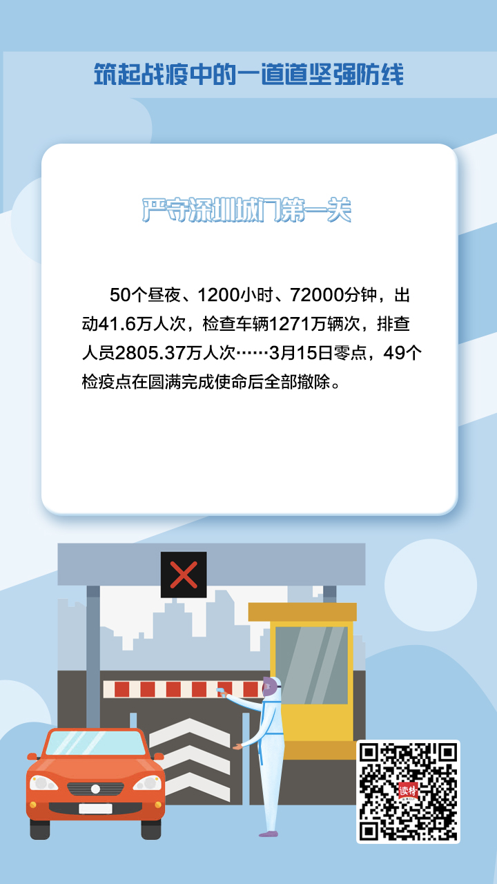 1月25日,深圳設(shè)置在全市市際公路入口處的49個入深車輛交通聯(lián)合檢疫點正式啟用,由深圳交警、派出所、衛(wèi)生防疫等部門和基層街道人員組成的檢查小組,24小時全天候聯(lián)勤輪班值守,按照“逢車必檢、逢人必檢”要求,對所有入城車輛和司乘人員進(jìn)行信息核查登記和體溫檢測,及時安置有發(fā)熱等癥狀的旅客,嚴(yán)守深圳城門第一關(guān)。