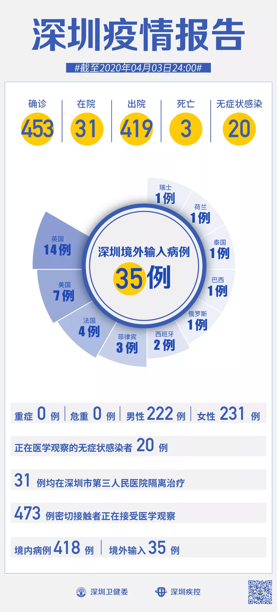 截至4月3日24時,深圳累計(jì)報(bào)告新冠肺炎病例453例。4月3日當(dāng)天新增1例境外輸入病例。