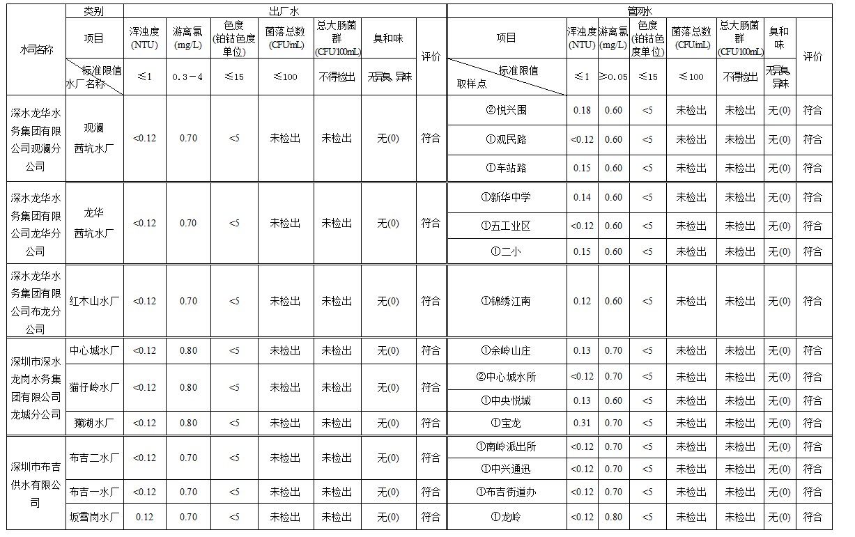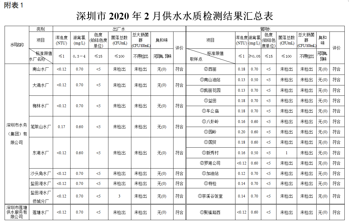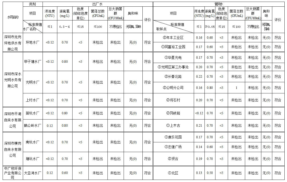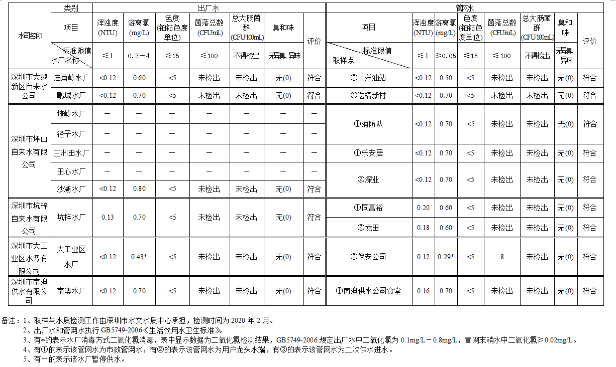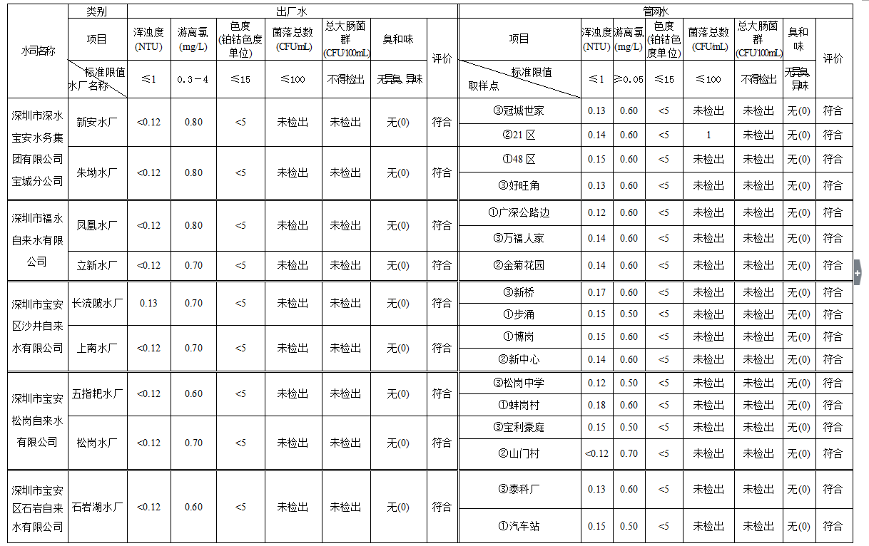 見圳客戶端·深圳新聞網(wǎng)2020年4月4日訊(見圳客戶端、深圳新聞網(wǎng)記者葉梅)2020年2月,深圳市水務(wù)局對全市42個水廠出廠水水樣以及68個管網(wǎng)水水樣進行了抽檢。檢測結(jié)果表明,依據(jù)GB5749—2006《生活飲用水衛(wèi)生標(biāo)準(zhǔn)》,所有受檢42個出廠水水樣和68個管網(wǎng)水水樣的渾濁度、消毒劑(游離氯或二氧化氯或總氯)、色度、菌落總數(shù)、總大腸菌群及臭和味共6項常規(guī)指標(biāo)全部符合該標(biāo)準(zhǔn)的規(guī)定,出廠水水樣合格率為100%,管網(wǎng)水合格率為100%。