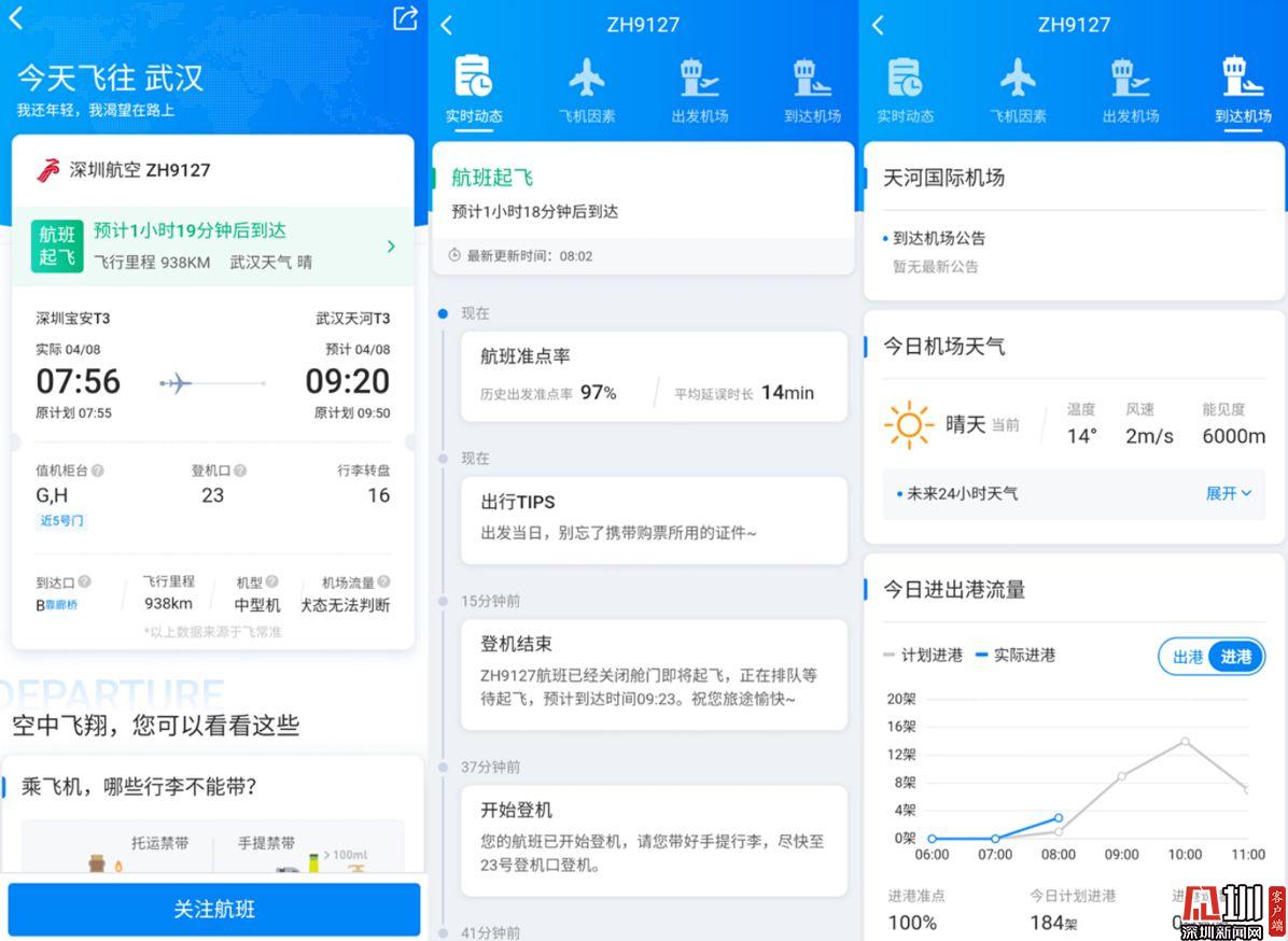 見圳客戶端·深圳新聞網(wǎng)2020年4月8日訊(見圳客戶端、深圳新聞網(wǎng)記者 張喆 陳致遠(yuǎn) 鐘鴻冰)4月8日7時55分,深圳航空ZH9127航班從深圳寶安國際機(jī)場起飛。這是自武漢市解除離漢離鄂通道管控措施后,從深圳機(jī)場飛往武漢的首架客運航班。