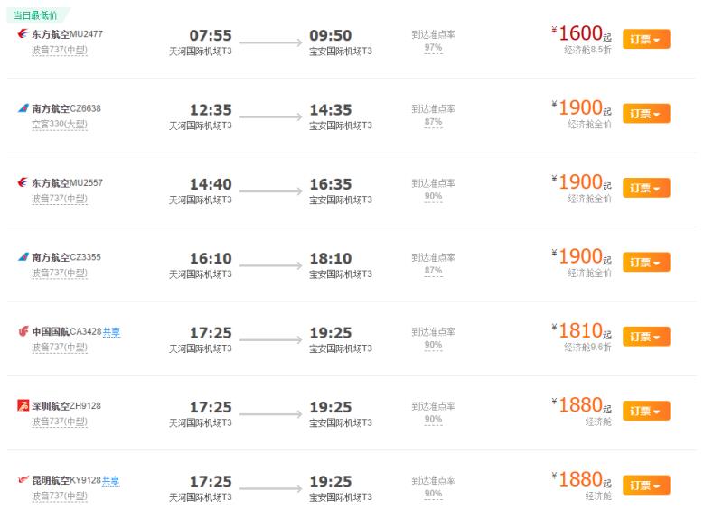 旅游app查詢到的當(dāng)日武漢飛深圳航班情況。