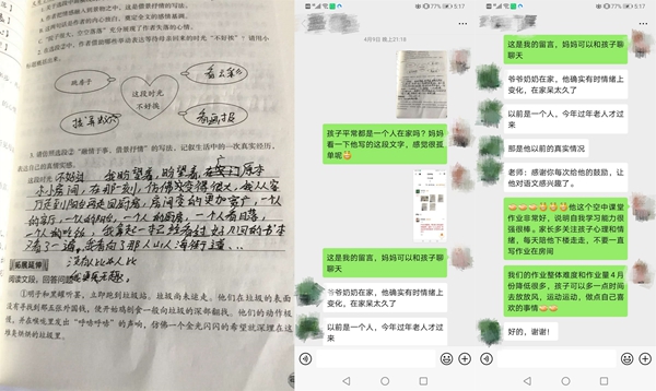 疫情來的迅猛又猝不及防,老師們一方面要完成教學(xué)任務(wù)、引導(dǎo)學(xué)生做好防疫,一方面要時刻關(guān)注學(xué)生的心理健康。學(xué)生們被迫在家度過了一個史上最長的寒假,對于處在叛逆期的孩子們來說,難免會與家人出現(xiàn)一些矛盾,在課堂之外,老師們還需要擔(dān)任“心理調(diào)節(jié)師”的角色。一次,周老師班上有個同學(xué)因為上網(wǎng)課的事情與父母鬧了矛盾,一氣之下跑到奶奶家,周老師得知了這件事情,第一時間聯(lián)系上學(xué)生,通過鼓勵、引導(dǎo),讓學(xué)生認(rèn)識到自己的錯誤,與父母和解。還有一次,周老師通過批改作業(yè),發(fā)現(xiàn)一名學(xué)生在作業(yè)中吐露了自己孤獨(dú)、無趣的心聲??吹胶?,周老師立刻與家長溝通了解情況,并建議家長多多陪伴孩子。盡管老師和學(xué)生們不能在學(xué)校的課堂上相聚,但在通訊十分發(fā)達(dá)的現(xiàn)在,老師們也始終用自己的方式陪伴在學(xué)生左右。