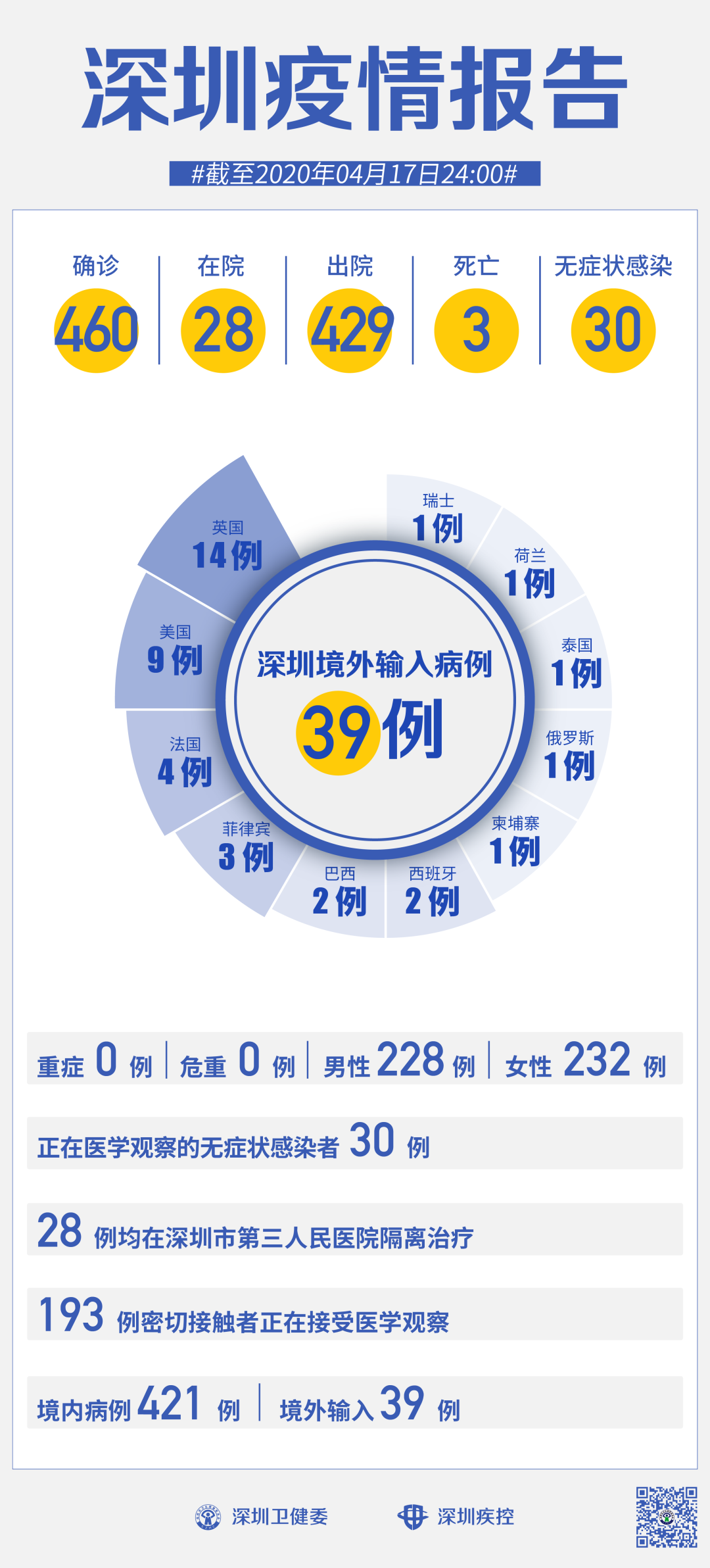 截至4月17日24時,深圳累計報告新冠肺炎病例460例。4月17日當天新增境內(nèi)病例1例。