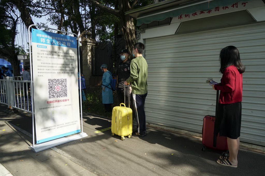 帶行李箱的學(xué)生走專用通道,依次完成掃碼核驗、測量體溫等流程后進(jìn)入校園。