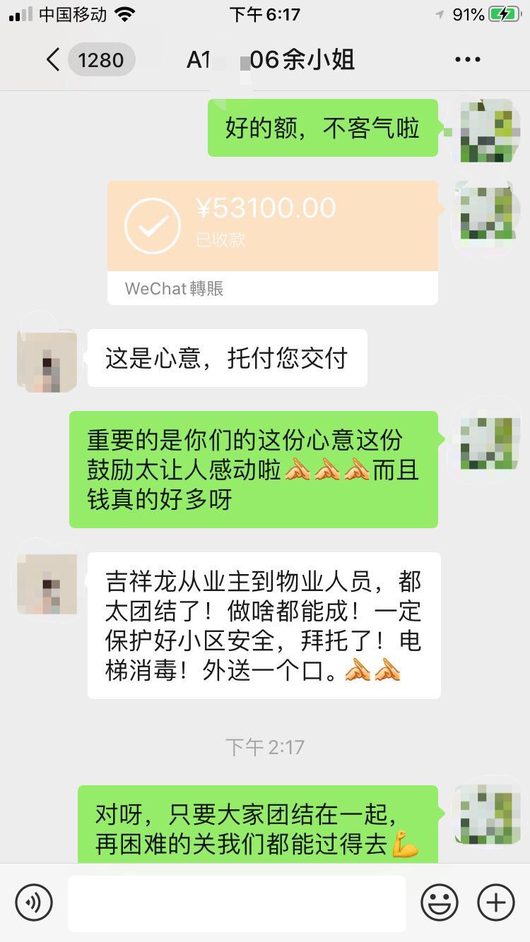 一天下來,吉祥龍小區(qū)共有156位愛心業(yè)主通過線上籌集款項53100元,最后以微信轉(zhuǎn)賬的形式轉(zhuǎn)給了吉祥龍小區(qū)服務(wù)中心負責(zé)人張經(jīng)理,并委托其轉(zhuǎn)交給堅守在工作崗位的每一位物業(yè)員工手中。