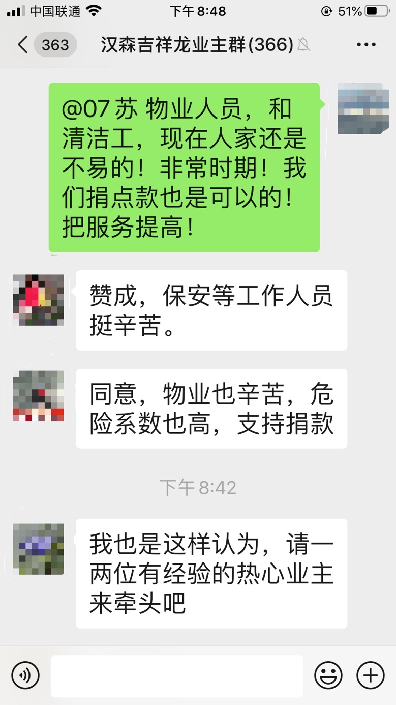 原來,吉祥龍小區(qū)業(yè)主因為覺得物業(yè)一線工作人員抗戰(zhàn)疫情工作危險又更辛苦,便在微信群內(nèi)發(fā)起了給本小區(qū)物業(yè)人員捐款的倡議,收到了眾多業(yè)主的熱烈反響。“贊成,保安等工作人員挺辛苦”、“同意,物業(yè)也辛苦,危險系數(shù)也高,支持捐款”……業(yè)主們通過討論,約定好捐贈方式全憑自愿、不搞強制、不論數(shù)額、謹表心意。短短一小時,捐贈金額就達到了3萬余元。業(yè)主余小姐表示,吉祥龍小區(qū)業(yè)主和物業(yè)人員在防疫過程中正團結(jié)一心、關(guān)系緊密,一定能保護好小區(qū)安全。