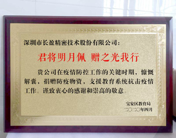 “君將明月佩,贈(zèng)之光我行”,接收物資后,寶安區(qū)教育局為長(zhǎng)盈精密公司贈(zèng)送題詞牌匾,以表示對(duì)該公司在防疫關(guān)鍵時(shí)期慷慨解囊,支援教育系統(tǒng)抗擊疫情工作的感謝和敬意。