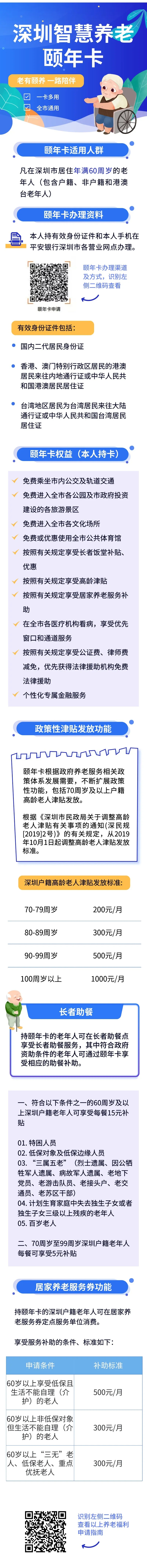 據(jù)悉,凡在深圳市居住年滿60周歲以上的老年人(包含港澳臺老年人),均可持有效身份證件和手機申請辦理?!邦U年卡”持卡人,可享受敬老優(yōu)待,包括免費進入全市各公園,免費進入市政府投資建設各旅游景區(qū),免費乘坐市內(nèi)公交車和軌道交通。70周歲及以上戶籍老人還可享受高齡津貼發(fā)放;符合規(guī)定的戶籍老年人可享受居家養(yǎng)老消費的優(yōu)惠和補貼,包括:生活照料、家政服務、康復護理服務、日托服務、心理咨詢等。
