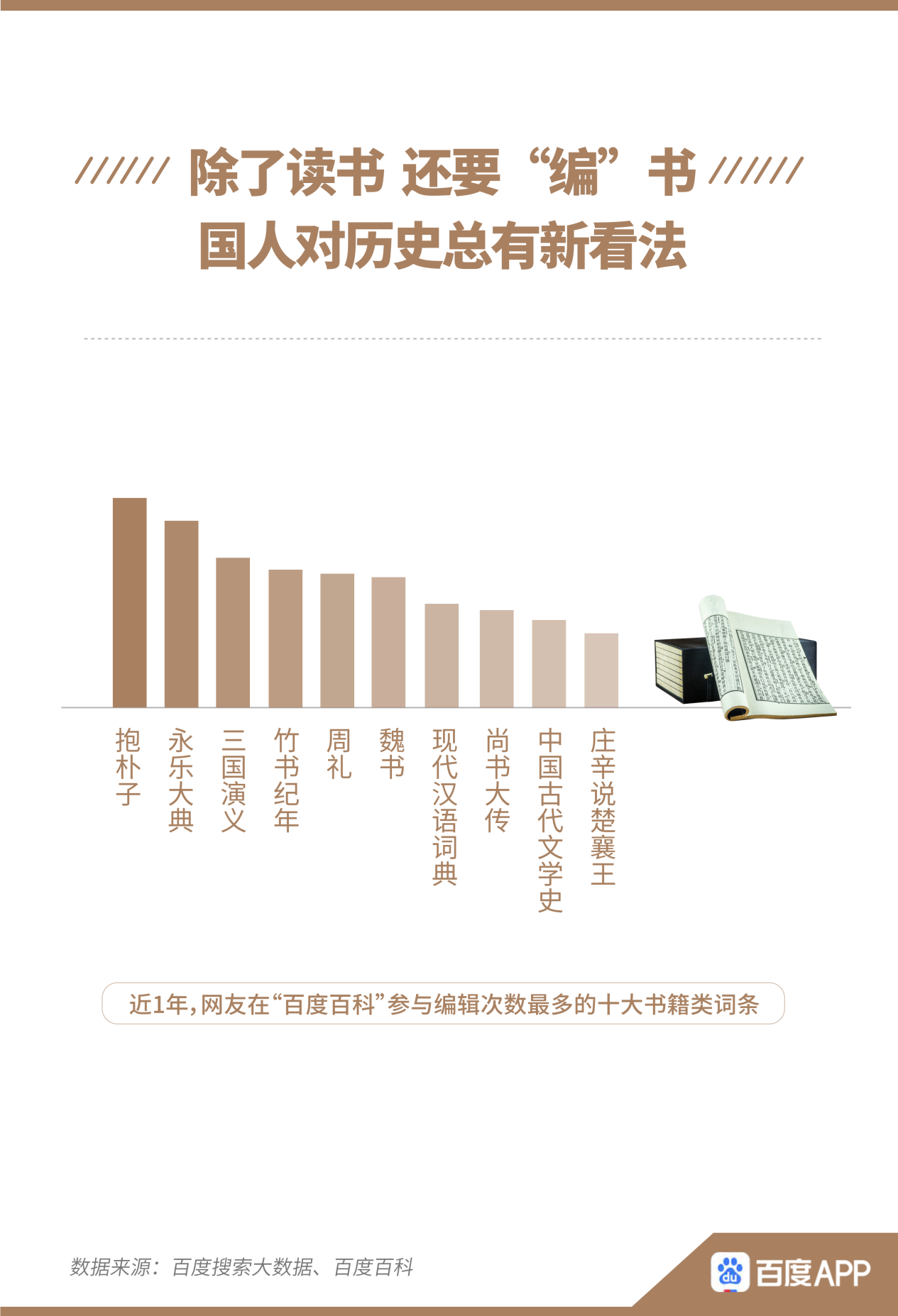 不僅讀書,這一屆網(wǎng)友還要“編”書。其中,網(wǎng)友對歷史著作總有新看法。報告顯示,近1年,網(wǎng)友在百度百科參與編輯次數(shù)最多的十大書籍類詞條,歷史著作占7席?!队罉反蟮洹吩?00年后仍舊“編輯”不停。