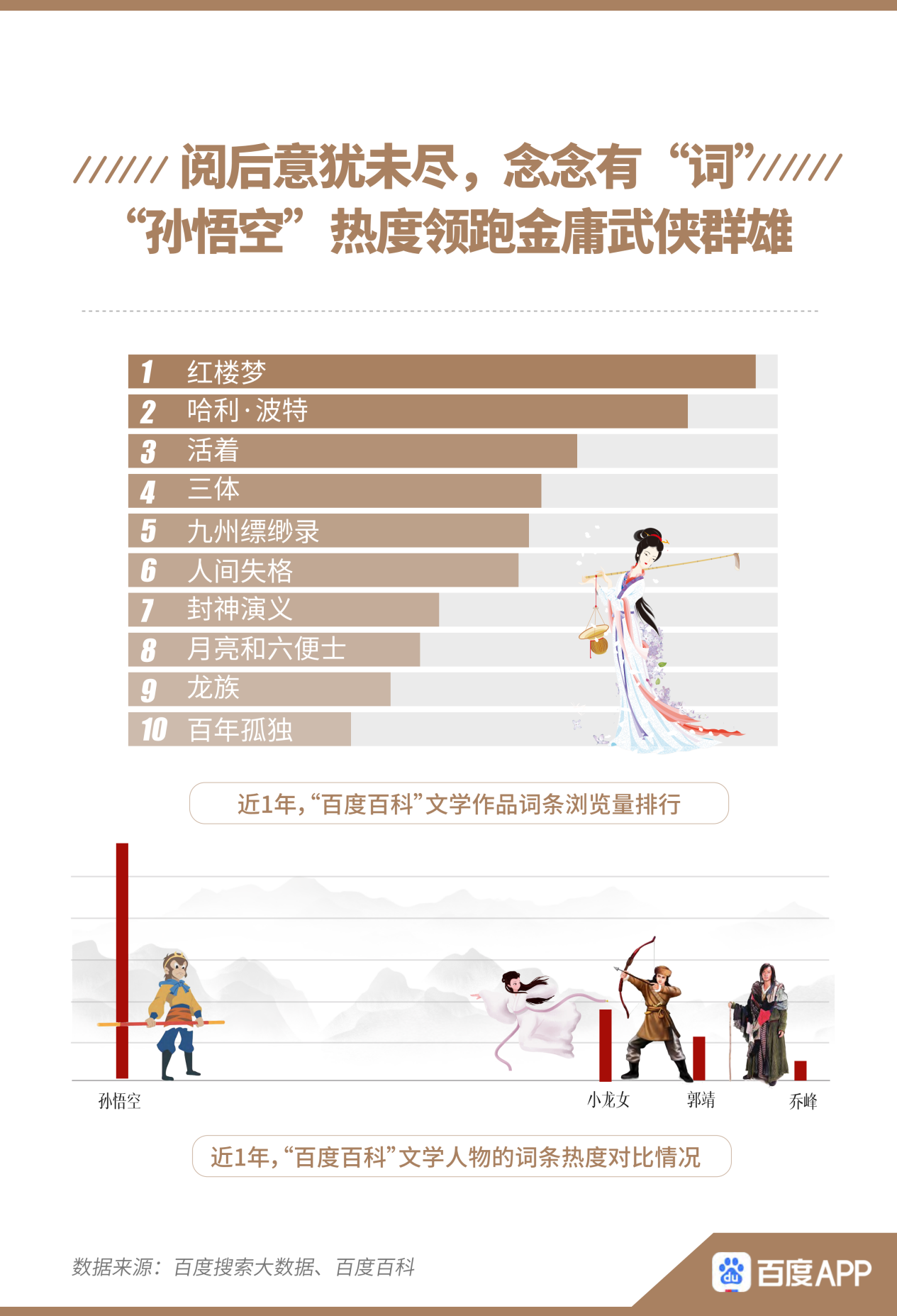 而百度百科的數(shù)據(jù)表明,人們在閱讀經(jīng)典書籍后,點擊詞條查看更多背景、釋義也是常態(tài)。《紅樓夢》、《哈利·波特》、《活著》、《三體》是近1年來網(wǎng)友在百度百科瀏覽較多的文學作品相關詞條。