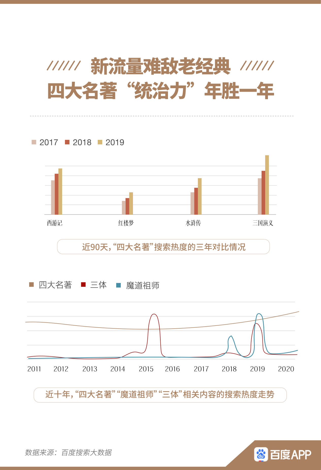 報告指出,近90天,“四大名著”搜索熱度的三年對比情況呈現(xiàn)出年年上升的趨勢,對比如《三體》、《魔道祖師》等近年的熱門書籍,四大名著搜索熱度走勢更加穩(wěn)定向上,體現(xiàn)出強大的“統(tǒng)治力”。