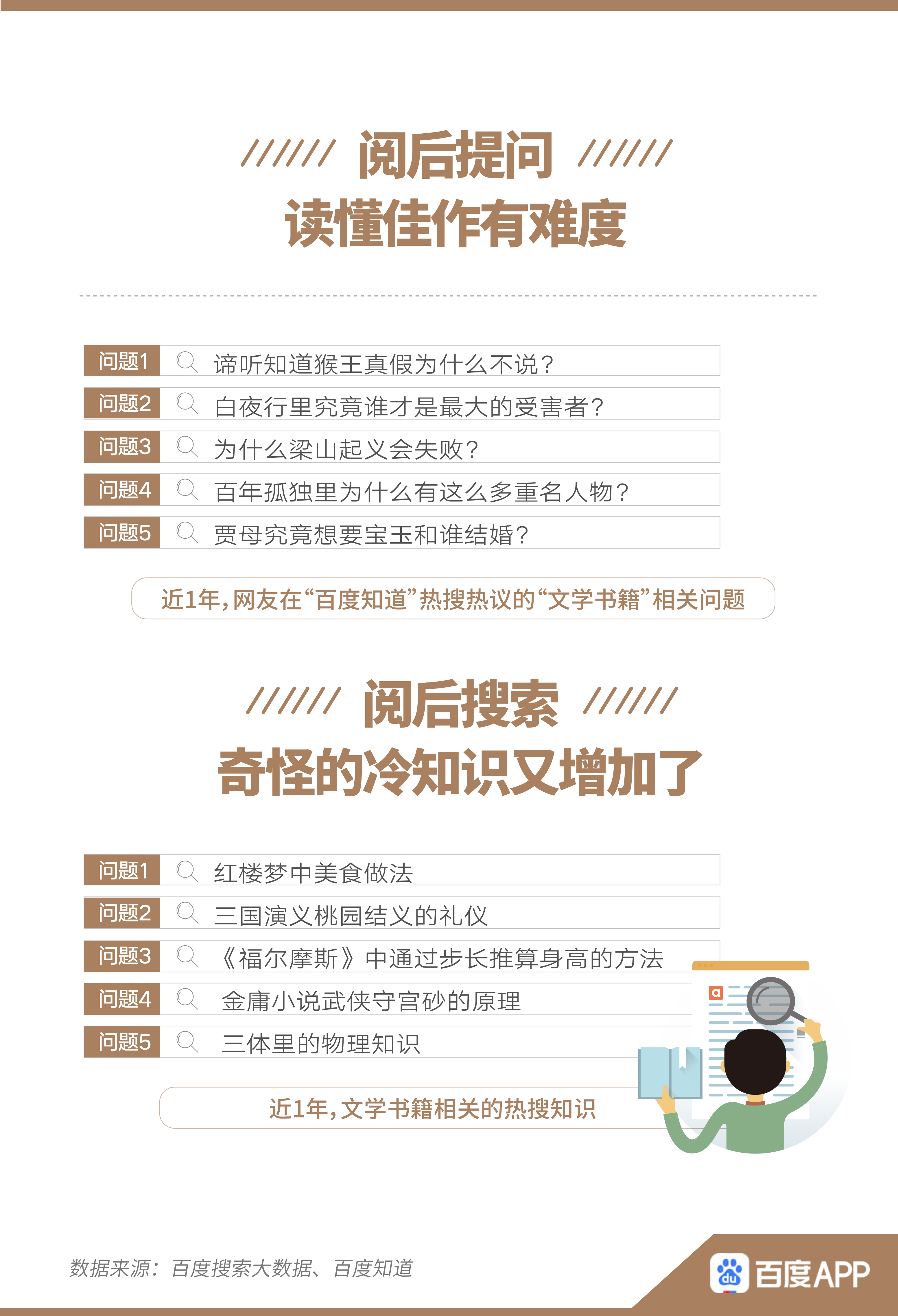 閱后提出對書籍的疑惑、討論思考、參與表達,均是讀者的重要需求。報告顯示,近1年,不少網(wǎng)友在閱讀之后,選擇到百度知道提問、討論。例如,“諦聽知道猴王真假為什么不說”、“白夜行究竟誰是最大受害者”等情節(jié)相關問題,均引起網(wǎng)友的熱搜熱議。除此之外,在百度搜索與主要情節(jié)無關的“冷”知識的人也不在少數(shù),如“紅樓夢中美食做法”、“三體里的物理知識”等。