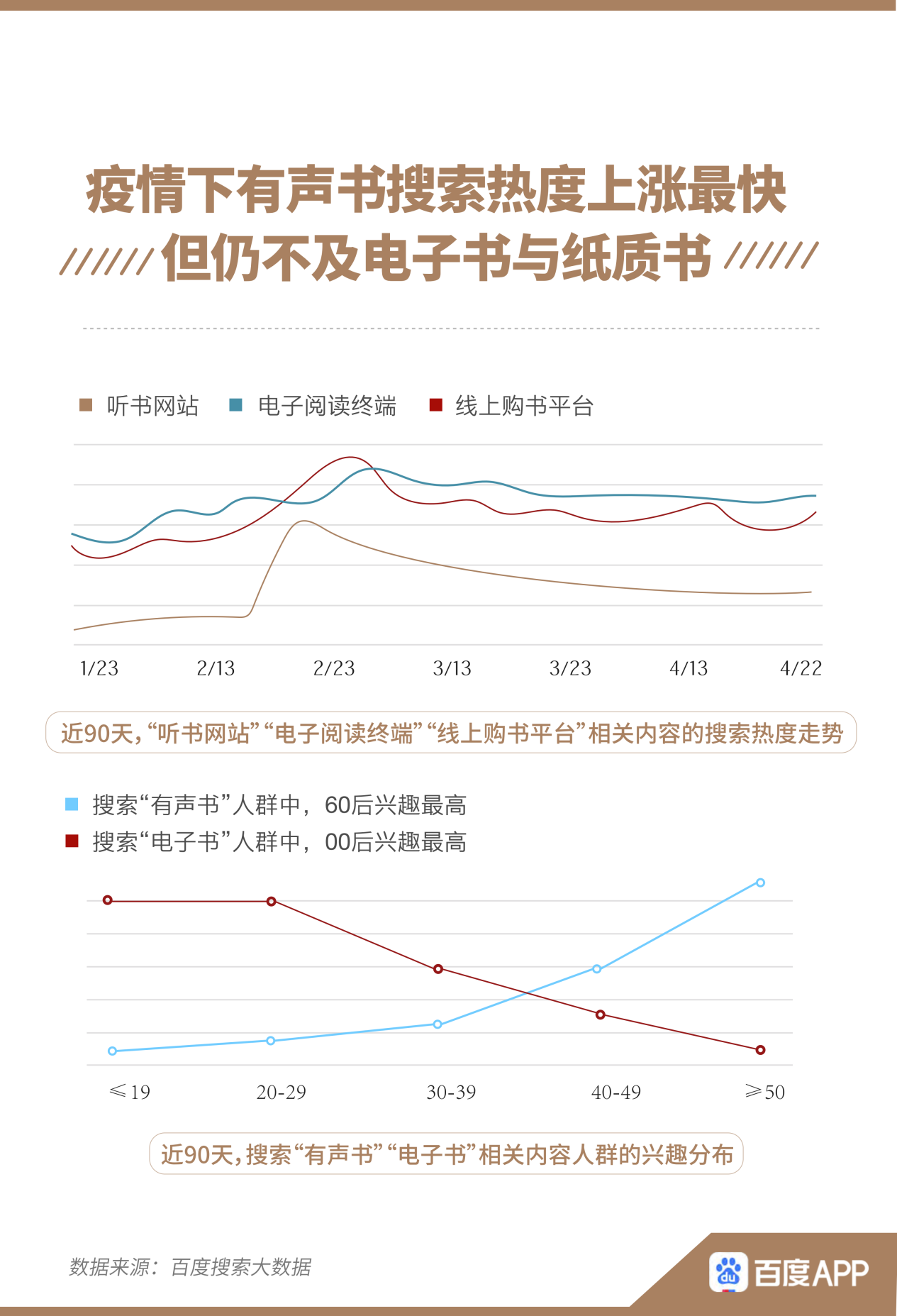 此外,在閱讀方式上,不同年齡也出現(xiàn)不同的偏好。疫情之下,“聽書網(wǎng)站”相關內(nèi)容的搜索熱度上漲趨勢明顯,但未能超越“電子閱讀終端”、“線上購書平臺”。在搜索“有聲書”人群中,60后的興趣最高,00后則更能接受“電子書”。