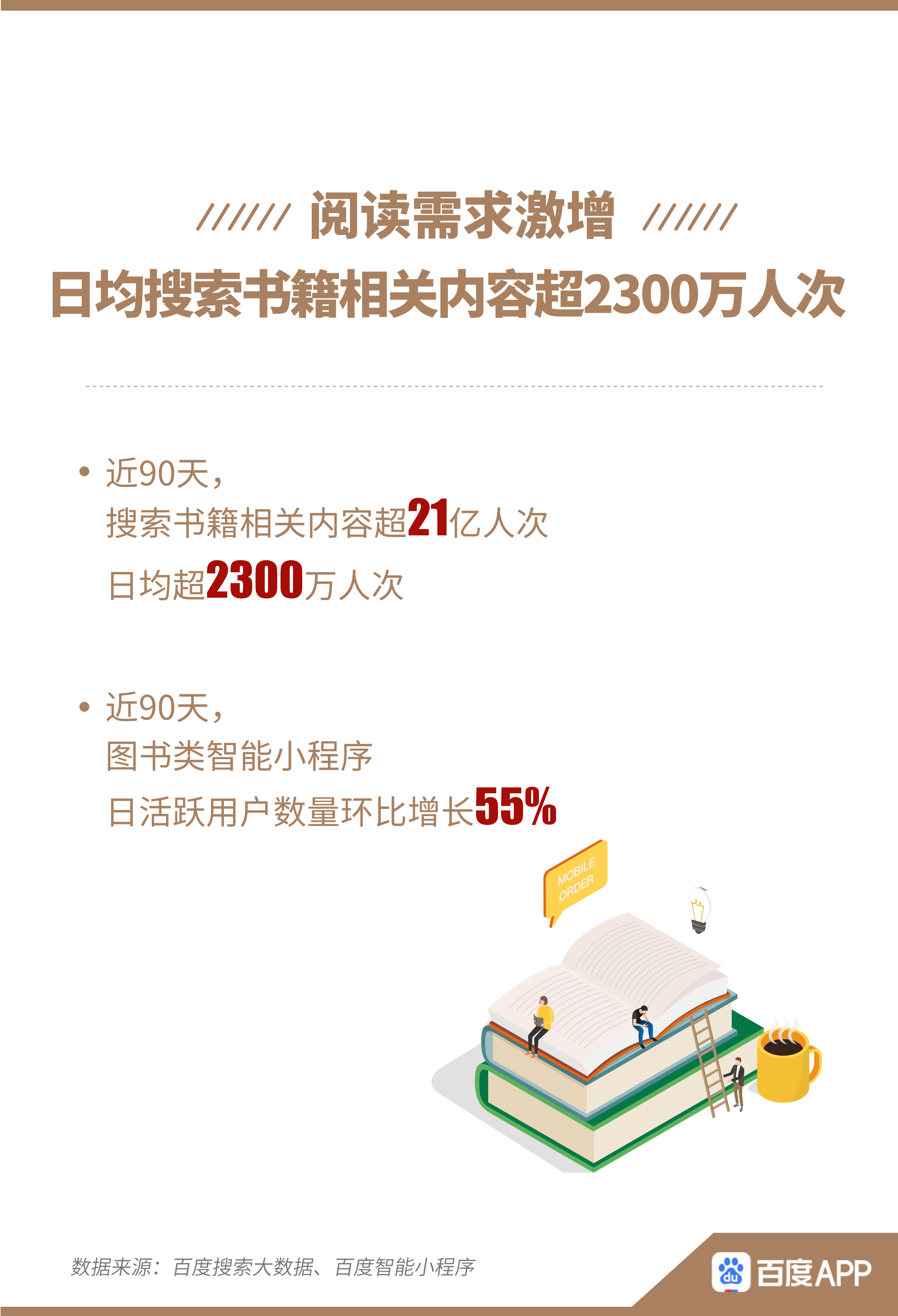 近日,百度APP聯(lián)合人民日報數(shù)字傳播《有數(shù)青年》工作室發(fā)布的《百度全民讀書搜索大數(shù)據(jù)報告》(以下簡稱“報告”)顯示,疫情宅家使網(wǎng)友閱讀需求激增,近90天,日均超2300萬人次在百度搜索書籍相關內(nèi)容,累計超21億人次,圖書類智能小程序日活躍用戶環(huán)比增長55%,讀書、購書線上化再進一步。