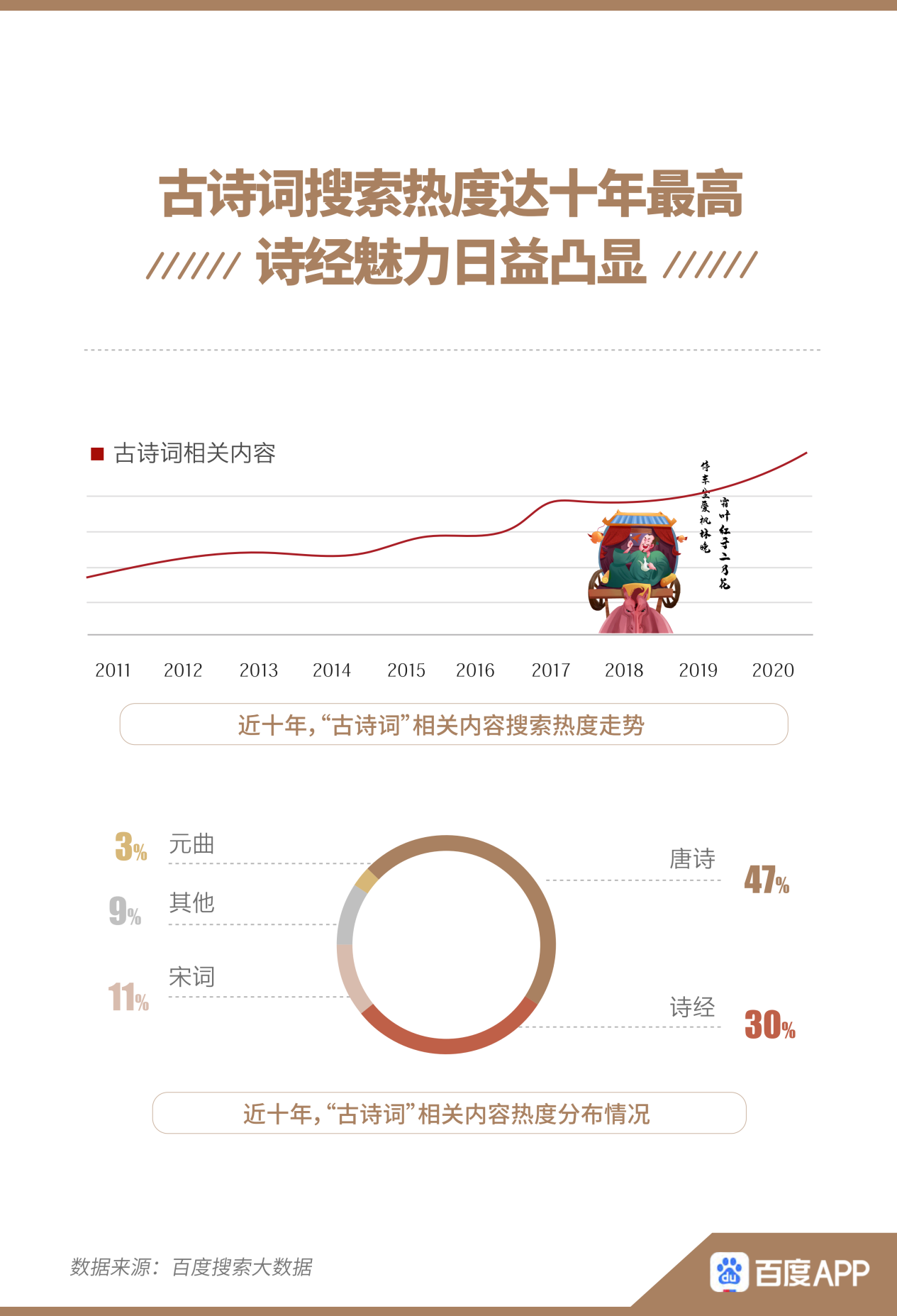事實上,“四大名著”熱度年勝一年的背后,是人們對傳統(tǒng)文化的熱愛日益提升。這也反映在古詩詞的搜索熱度之上。報告顯示,古詩詞搜索熱度逐年攀升,在2020年達十年最高。詩經(jīng)越來越多地出現(xiàn)在人們視野之中,搜索熱度占比30%。