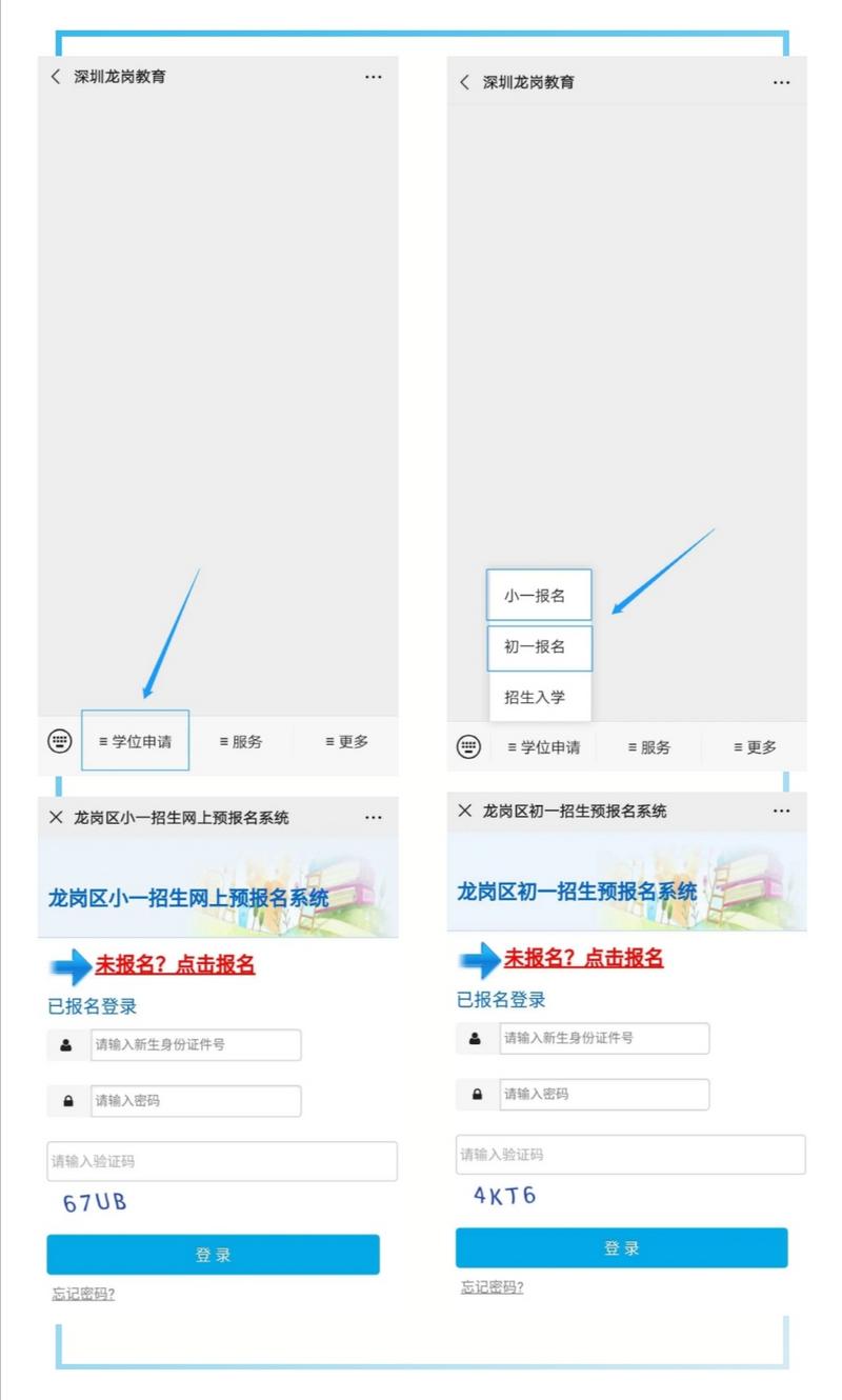 和以往一樣,家長可以登錄龍崗政府在線網(wǎng)站的“龍崗區(qū)教育局基礎教育科”頁面(http://www.lg.gov.cn/bmzz/zs/)進行學位申請報名,不過今年,家長多了一個更加便捷的報名方式,通過關(guān)注“深圳龍崗教育” 微信公眾號,在“學位申請”欄目中點擊“小初一報名”,憑適齡兒童、少年身份證號進入,填寫學位申請信息,填報學校志愿。確認信息無誤后直接保存,同時產(chǎn)生申請學位的流水號,即完成網(wǎng)上預報名。