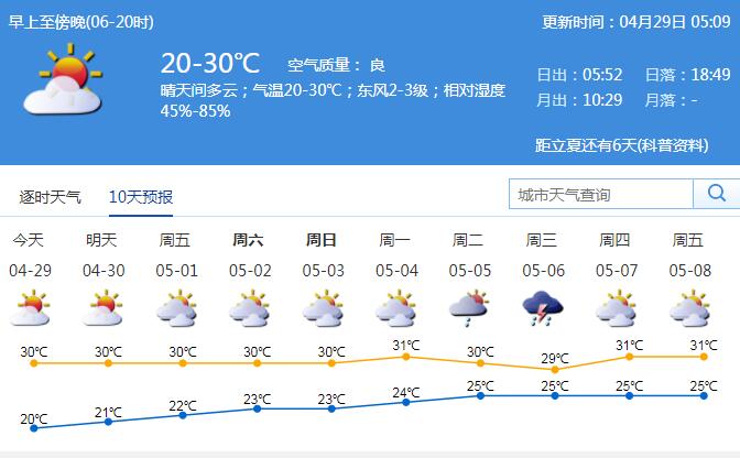 見圳客戶端·深圳新聞網2020年4月29日訊 29日氣溫20-30℃,晴天間多云;東風2-3級,相對濕度45%-85%。展望五一假期期間(1-5日)天氣總體平穩(wěn),多云間陰天,早晚有輕霧,間中有短時陣雨。
