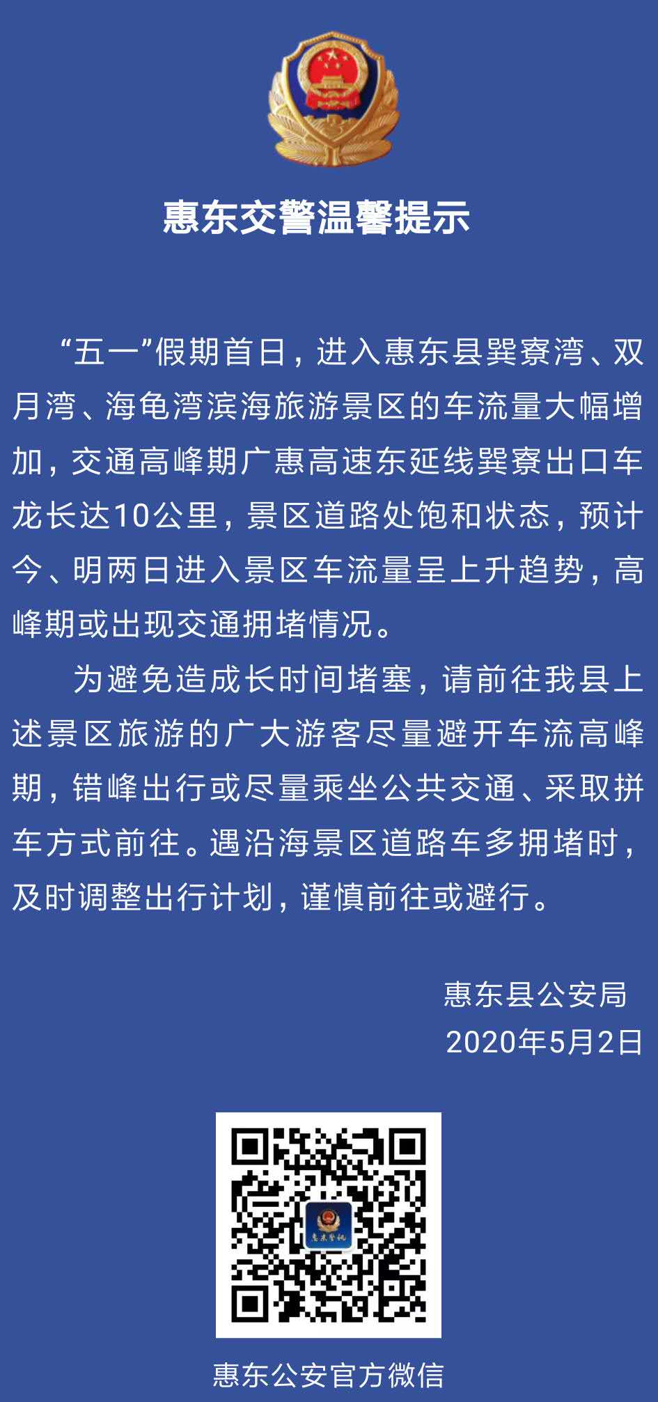 見圳客戶端·深圳新聞網(wǎng)2020年5月2日訊(深圳特區(qū)報(bào)記者 陳海峰 通訊員 羅漢波 文/圖)5月2日,惠州市公安局發(fā)布緊急提醒稱,“五一”假期首日,進(jìn)入廣東省惠州市惠東縣巽寮灣、雙月灣、海龜灣濱海旅游景區(qū)的車流量大幅增加,交通高峰期,廣惠高速東延線巽寮出口車龍長(zhǎng)達(dá)10公里,景區(qū)道路處飽和狀態(tài)。