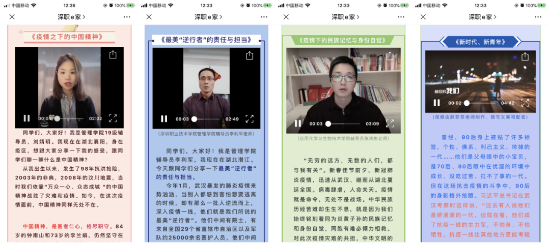深圳職業(yè)技術(shù)學(xué)院學(xué)生工作部組織33位青年輔導(dǎo)員,推出33講戰(zhàn)“疫情”系列微課程,每天8:30準(zhǔn)時(shí)推送。微課程主題涵蓋愛國主義教育、理想信念教育、生命教育、社會(huì)責(zé)任感教育、感恩教育,不同的主題、不同的視頻、不同的感悟,輔導(dǎo)員老師和同學(xué)們一起在戰(zhàn)“疫”中成長,為同學(xué)們講述每一個(gè)戰(zhàn)“疫”的感人故事。建環(huán)學(xué)院輔導(dǎo)員薛菲菲老師制作精美短視頻、撰寫文案、配樂、配音,以有思想又有溫度的方式與學(xué)生對(duì)話。她說,磨煉是成長的催化劑,抗疫是時(shí)代給予的成人禮,經(jīng)此一役,中國的年輕人們對(duì)責(zé)任和奉獻(xiàn)的感受更加直觀,對(duì)勇敢和擔(dān)當(dāng)?shù)睦斫飧由羁?,而中國,也因?yàn)?0后,收獲了青春洋溢的蓬勃力量!