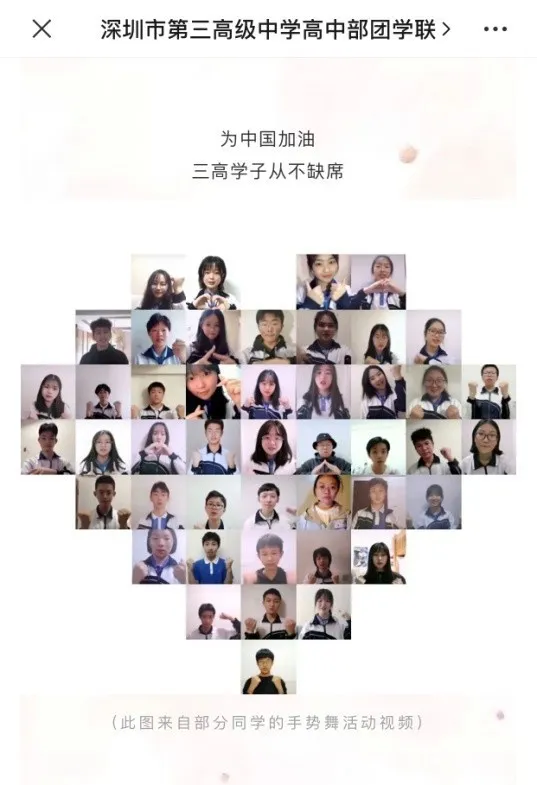 深圳市第三高級(jí)中學(xué)團(tuán)委的龐聰老師和同學(xué)們一起錄制了手勢(shì)舞《不放棄》,為抗疫一線吶喊加油!活動(dòng)先由龐聰老師和團(tuán)委學(xué)生聯(lián)合會(huì)的同學(xué)們策劃、學(xué)習(xí)、錄制、剪輯、審核,共同制作第一支手勢(shì)舞視頻。2月22日,他們?cè)诰W(wǎng)上發(fā)起手勢(shì)舞接力,收到上百名師生發(fā)來的接力視頻,經(jīng)過校團(tuán)委匯總、剪輯、發(fā)布,引起強(qiáng)烈的社會(huì)反響。龐老師說:“疫情無情,人間有愛,正是疫情讓我們緊緊地依靠在一起,手勢(shì)舞應(yīng)援雖不隆重盛大,但卻也凝結(jié)了我們師生對(duì)于疫情重地武漢的鼓勵(lì)與支持,對(duì)一線醫(yī)療工作者的無私奉獻(xiàn)的感謝?!?/p>