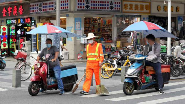 ▲保潔員戴著遮陽(yáng)帽在街頭忙碌。