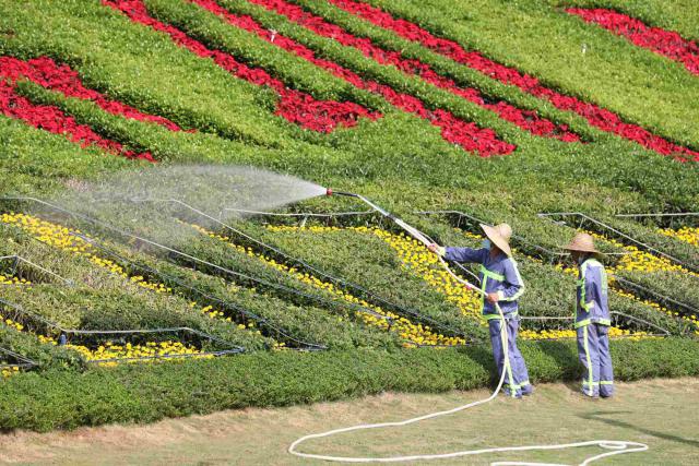 ▲公園里,戴著遮陽帽的工作人員忙著給花草"補水降溫"。