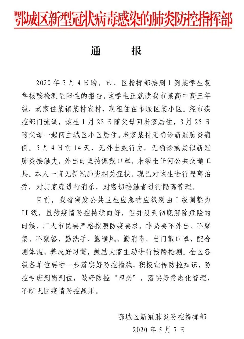 5月8日,湖北鄂州市鄂城區(qū)政府網(wǎng)站發(fā)布一則鄂城區(qū)新冠肺炎防控指揮部通報(bào)。