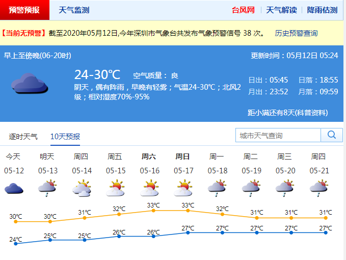 深圳昨夜雷電+大風黃色+暴雨黃色預警齊生效,市氣象臺于2020年05月11日23時30分在全市取消暴雨黃色、大風黃色預警。預計12日白天多云間陰天,有陣雨。13日陣雨轉(zhuǎn)多云,天況逐漸轉(zhuǎn)好,14-17日多云為主,陽光充足,天氣再趨炎熱。