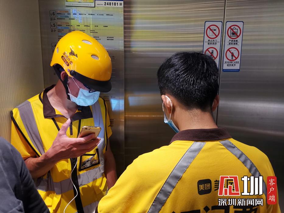 兩位外賣員在電梯里核對訂單派送信息。