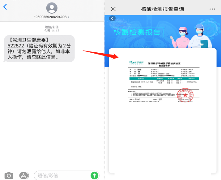 ④進(jìn)行短信驗(yàn)證后,即可查詢(xún)15天內(nèi)(從5月11日起)的核酸檢測(cè)報(bào)告