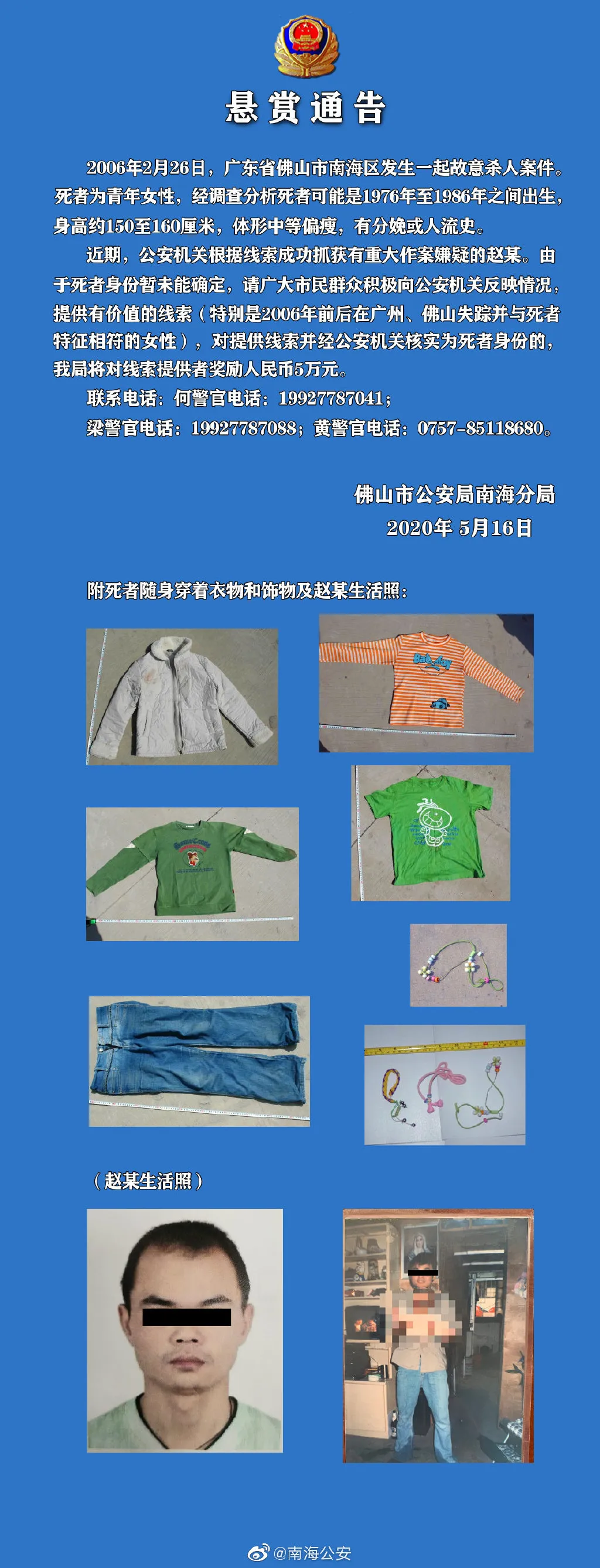 5月16日,廣東佛山市公安局南海分局官微發(fā)布了一條“懸賞公告”,尋找一起14年前的故意殺人案中被害女性的線索,警方將對(duì)有效線索提供者獎(jiǎng)勵(lì)人民幣5萬(wàn)。